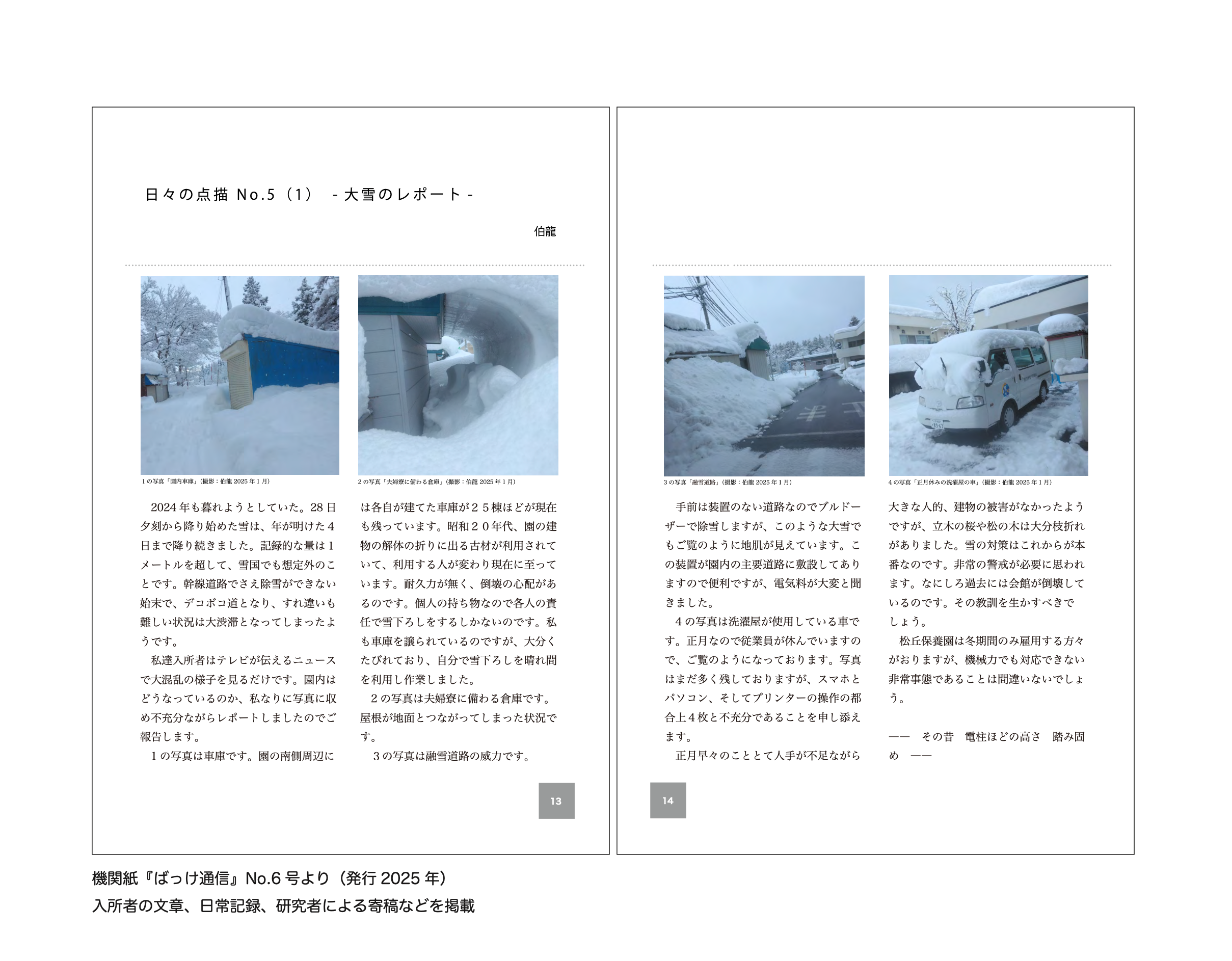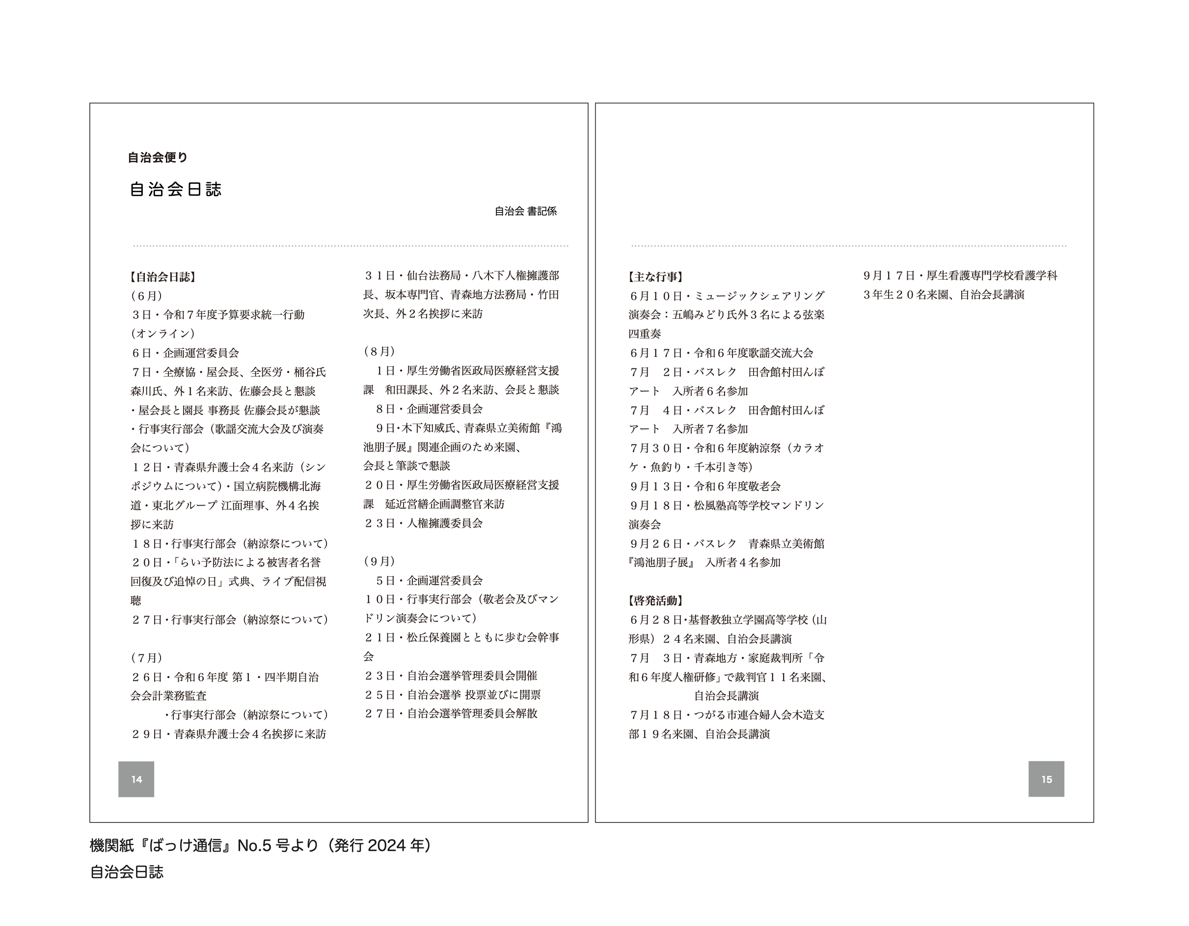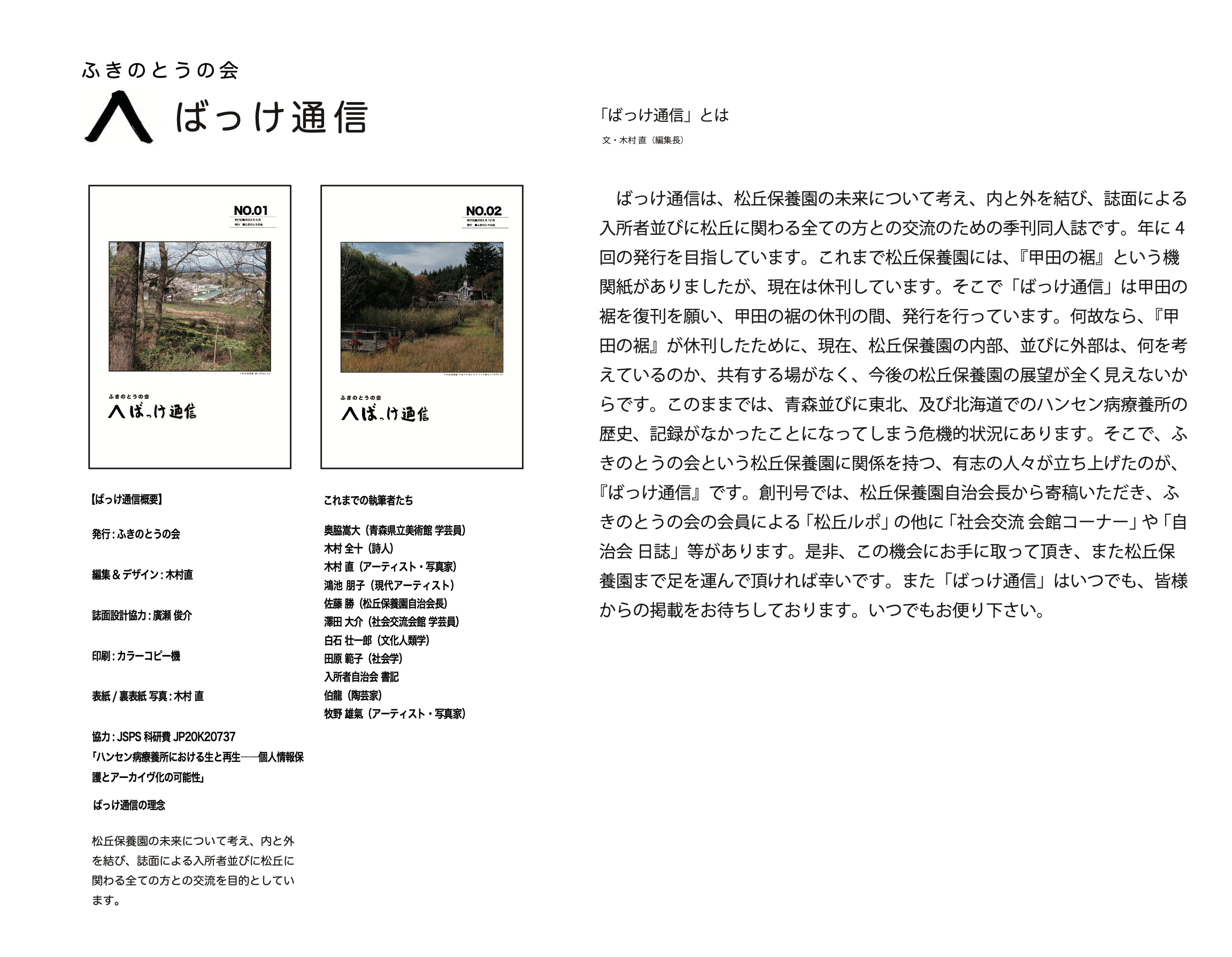 「ばっけ通信」は、松丘保養園の未来について考え、内と外を結び、交流の場をつくるために「ふきのとうの会」が発行する季刊同人誌です。休刊中の機関紙『甲田の裾』の役割を引き継ぎ、入所者や関係者の声や記録を共有することで、療養所の現在とこれからを可視化することを目的としています。