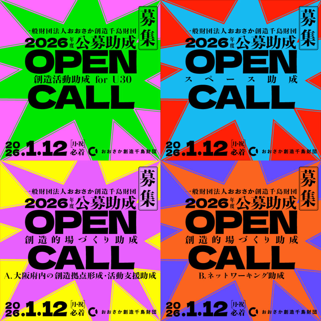 おおさか創造千島財団では、大阪の創造環境の向上、つまりアーティストやクリエイター等が活動しやすい状況を整備し、また創造性が触発されるような環境を生み出すことを目的として、公募助成事業を行っています。2026年度は、4つのカテゴリで公募助成プログラムを実施します。